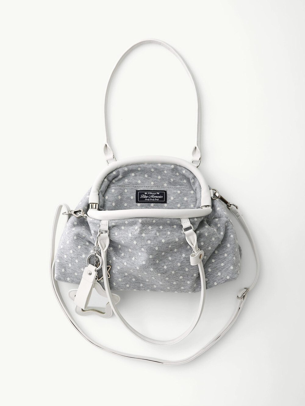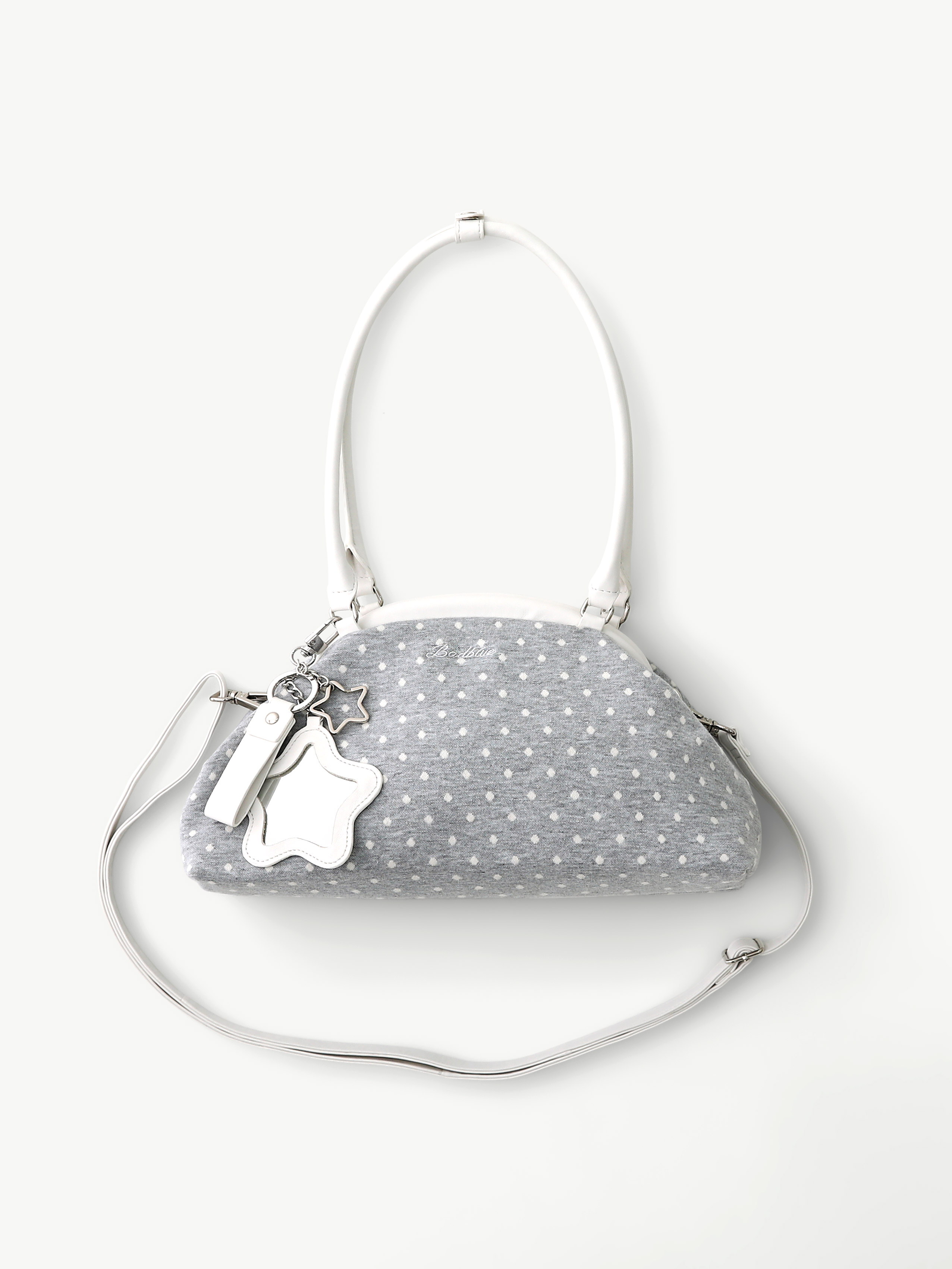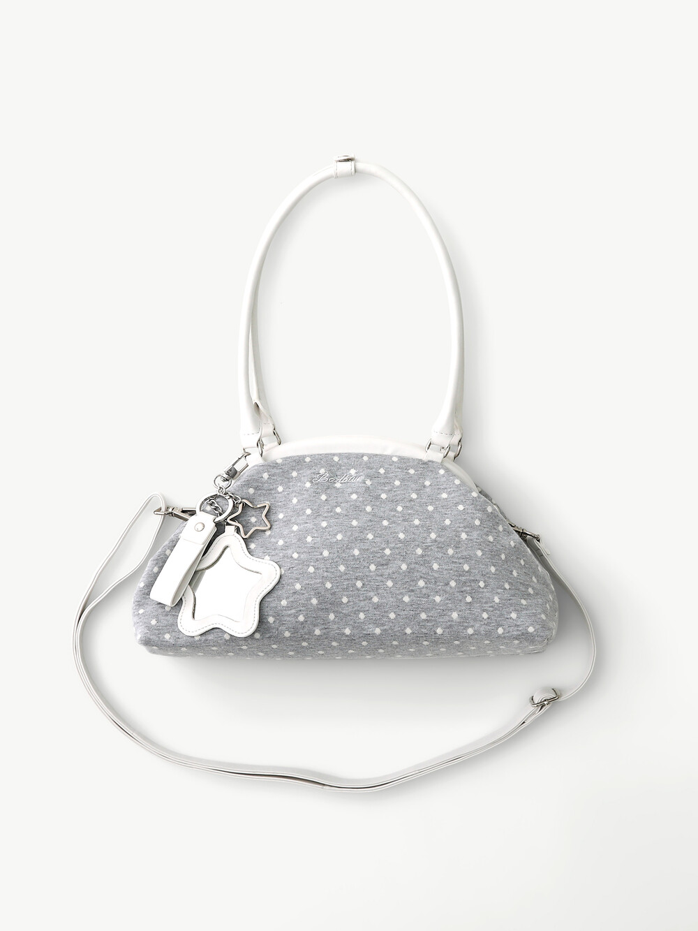 A dumpling-shaped bag in soft polka-dot cotton, finished with a nickel frame opening for a cozy, playful feel.