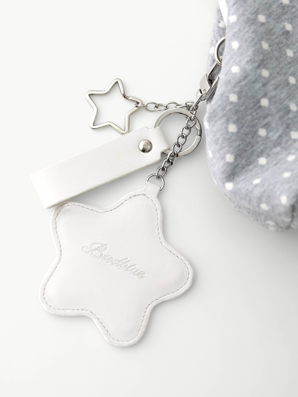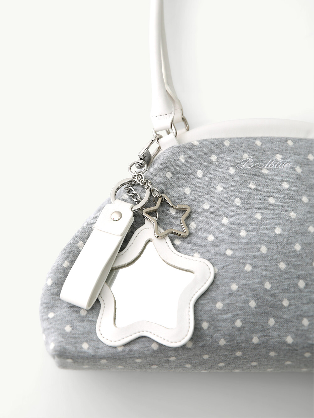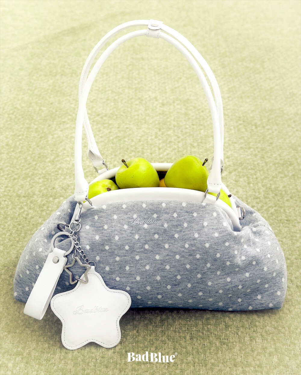 A dumpling-shaped bag in soft polka-dot cotton, finished with a nickel frame opening for a cozy, playful feel.