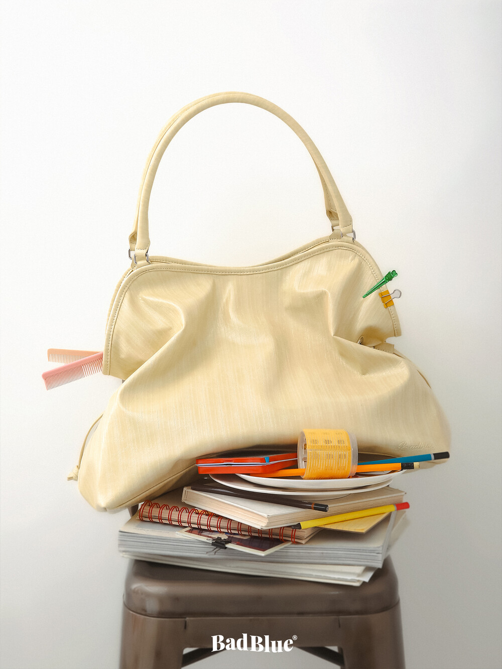 Crafted from glazed vegan leather in a soft vanilla tone with a hint of lemon.